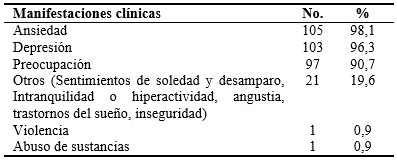 De manera general, la ansiedad y la depresión constituyeron las principales manifestaciones clínicas diagnosticadas, con 98,1 % y 96,3 % de los casos respectivamente. Fue detectada en la mayoría de las personas entrevistadas más de una manifestación. (Tabla 3).
