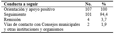 En cuanto a la conducta a seguir, a la totalidad de las personas se les brindó orientación y apoyo positivo; seguimiento al 94,4 %; en cuatro casos se identificaron, además, descompensación de enfermedades psico-psiquiátricas de base, o peligro para la integridad individual, en los cuales se solicitó remisión a servicios especializados. (Tabla 4).