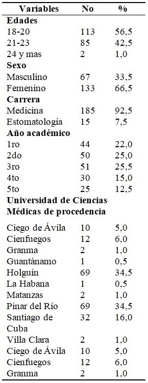 Método: estudio multicéntrico, observacional, descriptivo y transversal en estudiantes de las Ciencias Médicas de Cuba en el mes de julio de 2020. La muestra la constituyeron 200 estudiantes seleccionados mediante un muestreo tipo Snow boll. Para la recolección de la información se empleó un formulario de Google (Google Forms).