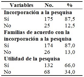 El 87,5 % de los estudiantes encuestados refirieron haberse incorporado a la realización de las pesquisas activas. En el 87,0 % de los casos los familiares no presentaron ninguna objeción a su incorporación a la realización de esta tarea. El 66,0 % de los estudiantes encuestados manifestaron que le encontraron utilidad a la pesquisa activa. (Tabla 2).