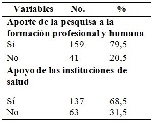 El 79,5 % de los estudiantes afirmaron que su incorporación a la realización de las pesquisas activas en tiempos de la pandemia COVID-19 tuvo una gran influencia positiva en su formación tanto profesional como humana. El 66,5 % de los estudiantes desarrollaron el proceso de estudio durante este periodo de pesquisa. El 68,5% de los estudiantes manifestaron sentir apoyo de las distintas instituciones de salud durante la etapa de la pesquisa (Tabla 3).