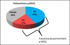 La frecuencia alélica del polimorfismo p.K952L fue de 38,6 %. (Tabla 2).