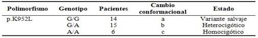 Se detectó el cambio conformacional b en 15 pacientes, el cambio conformacional c en 6 y el cambio conformacional a en 14 individuos. Los cambios conformacionales a, b y c correspondieron a la variante salvaje, estado heterocigótico y homocigótico para el polimorfismo p.K952L, respectivamente. (Tabla 1).