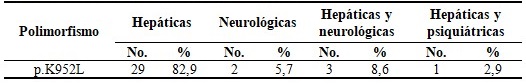 Entre las principales manifestaciones clínicas en los pacientes que presentaron el polimorfismo p.K952L, fueron más frecuentes las hepáticas (82,9 %), seguidas de las manifestaciones mixtas: hepáticas y neurológicas (8,6 %). (Tabla 3).