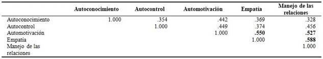 Los valores más elevados aparecen entre las dimensiones empatía y manejo de relaciones lo que pudiera fundamentarse por el hecho de que ambas conforman el área interpersonal del constructo. Por otro lado, la dimensión autoconocimiento, muestra correlaciones más débiles con el resto de las dimensiones. Se debe tener en cuenta que está es la dimensión básica, a partir de la cual se desarrollan el resto de las dimensiones. Para estudios futuros, se requiere de un mayor análisis respecto al contenido o diseño de los indicadores que la integran.