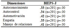 Las dimensiones correlacionan de forma positiva y moderada con la escala BIEPS-J. Resulta interesante destacar que, dentro de las dimensiones del ICEA, las correlaciones más altas se obtuvieron en las dimensiones relacionadas con la automotivación y el manejo de relaciones. (Tabla 3).