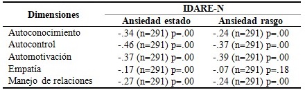 Las dimensiones del ICEA correlacionan negativa y significativamente con el IDARE-N estado, de forma moderada con el área intrapersonal y débil con la interpersonal. Con el IDARE-N rasgo, las dimensiones de autocontrol y automotivación correlacionan moderadamente, mientras que autoconocimiento y manejo de relaciones tienen correlaciones débiles y empatía no mostró correlación como se observa en la (tabla 4).
