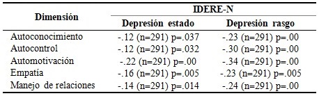 La magnitud de las correlaciones entre las dimensiones del ICEA y el IDERE- N depresión estado es de magnitud débil, mientras que con IDERE-N rasgo mantiene una correlación de magnitud moderada con la automotivación, y débil con el resto de las dimensiones. (Tabla 5).