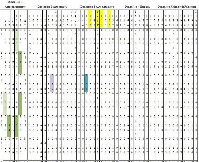 La matriz de correlaciones inter-incisos cuantificó la fortaleza de los agrupamientos de los incisos en el inventario (ver anexo 2). Para determinar la fuerza de la correlación se estableció la siguiente escala: correlación alta si es mayor a .41; media entre .30 - .40 y baja menor que .29. En las dimensiones pertenecientes a la esfera intrapersonal los valores de las correlaciones oscilaron entre medios y bajos. Las correlaciones más altas superan el valor de .5; presentes en los incisos de las dimensiones empatía y manejo de relaciones. La mayoría de los incisos correlacionan con mayor fuerza con aquellos que pertenecen a su misma dimensión. Se eliminaron ocho incisos que mostraron correlaciones débiles tanto con los integrantes de su propia dimensión como con el resto del inventario. De ahí que se obtiene una versión del inventario compuesta por 43 incisos.