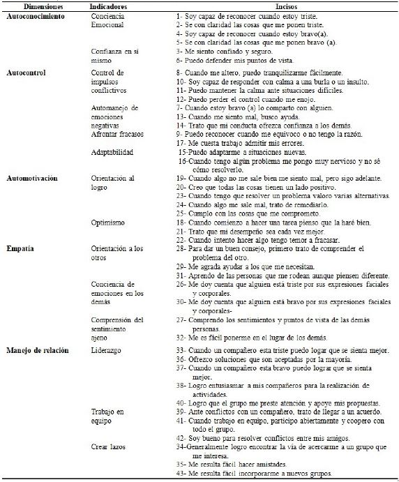 Results: From the judgment of experts and the factor analysis, an instrument of 43 items is obtained with a multidimensional structure of 5 factors, which correspond to the emotional capacities described in the Goleman model: self-knowledge, self-control, self-motivation, empathy and relationship management. Positive and moderate correlations are obtained with the BIEPS-J scale; negative and moderate with the IDARE-N, negative and moderate with depression as a trait and negative and weak with depression as a state. Internal consistency is high (Cronbach's Alpha = .86)