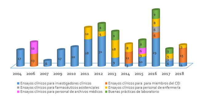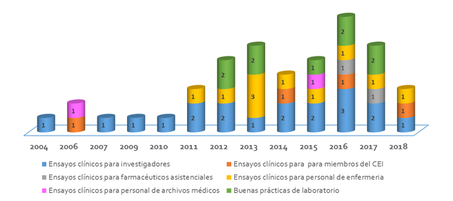 Al analizar la capacitación según los cursos impartidos por años, se evidenció que el curso para investigadores clínicos se impartió en todos los años excepto en el 2005 y 2006, momento en que se capacitó al personal en relación al Comité de Ética de la Investigación y Ensayos clínicos para personal de archivos médicos. A partir del año 2012 se produjo un incremento en la cantidad de cursos impartidos, principalmente los dedicados a la capacitación de los investigadores clínicos, el personal de enfermería y el personal de medios de diagnóstico. (Gráfico 1).