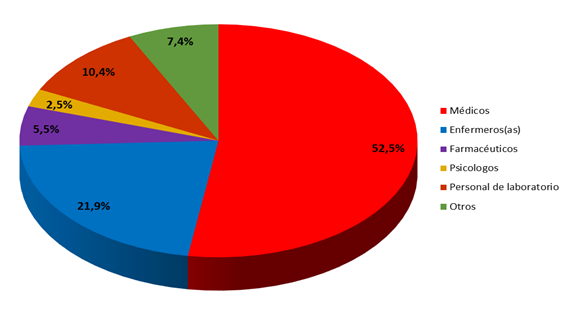 Del total de investigadores capacitados, el 52,5 % son médicos y el 21,9 % corresponde al personal de enfermería. Solo el 10,4 % representa al personal de laboratorio, el 5,5 % al personal de farmacia y 2,5 % a psicólogos. Se ha capacitado a otros investigadores que responden a otras profesiones (ingenieros, tecnólogos de la salud, técnicos de archivo) lo que representó el 7,4 %. (Gráfico 3).