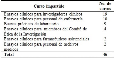 Los cursos dirigidos a preparar a los investigadores clínicos y el personal de enfermería fueron los más impartidos debido a la cantidad de recursos humanos a capacitar. Este resultado coincide con lo publicado por Silva Valido J et al. 8 en que de un total de 45 cursos, la mayor parte estuvo dirigida a la preparación de investigadores clínicos y personal de enfermería.