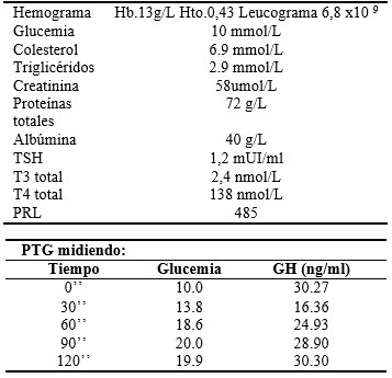 Al mismo tiempo fue diagnosticada una diabetes mellitus posiblemente secundaria a la aparición de la acromegalia, tratada con insulina NPH en dos subdosis.