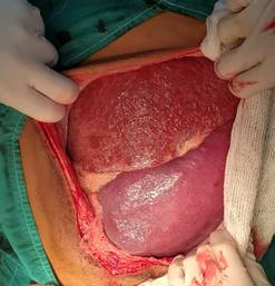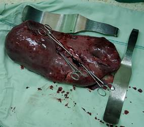 Después de ser evaluado por cardiología, así como realizar la preparación por hematología, se realiza tratamiento quirúrgico. Se efectuó laparotomía exploradora con los siguientes hallazgos: bazo que ocupa todo hemiabdomen izquierdo y fosa ilíaca izquierda de aproximadamente 50 centímetros, de borde romo y superficie nodular, consistencia firme, con angulación del pedículo esplénico, hígado de aproximadamente 25 centímetros de superficie granular fina, bazo accesorio de 1 centímetro en epiplón mayor, signos de hipertensión portal (Fig. 1 y Fig.2). Se realiza esplenectomía convencional sin complicaciones, con sangrado intraoperatorio de 150 mililitros y tiempo quirúrgico de 115 minutos. Se deja drenaje abdominal en la celda esplénica. (Fig. 3).