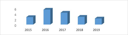 En el periodo estudiado se produjeron 2154 egresos definitivos desde la Unidad de Cuidados Intensivos Pediátricos de Cienfuegos, y de ellos 77 casos desarrollaron algún tipo de infección nosocomial. El mayor número de infecciones ocurrió en el año 2016 (19 casos), para una tasa de 5,4 por cada 100 egresos y el 2017 con 18 infecciones nosocomiales, para una tasa de 4,3 por 100 egresos, con una tasa promedio de 3,5 casos por cada 100 egresos durante el quinquenio. (Gráfico 1).