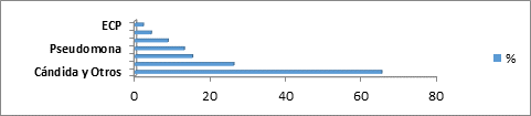 Entre los microorganismos aislados destacó Acinetobacter en 12 pacientes para un 26,1 %; Klebsiella representó el 15,2 % de las muestras positivas; Pseudomona aeruginosa estuvo presente en 6 casos para un 13 %; E. coli en el 8,7 % entre los gérmenes gram negativos con menor aislamiento. Dentro de los gérmenes Gram positivos se aislaron el 4,3 % de Estafilococo coagulasa negativo y 2,2 % para Estafilococo coagulasa positivo. El género Cándida y otros agentes se aislaron en un 65,2 %. (Gráfico 2).