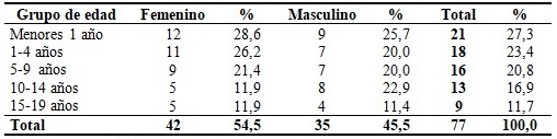 En este estudio, el grupo de edad más afectado fue el de menores de un año con un 27,3 %, seguido del grupo de 1 a 4 años y el de 5-9 años con 23,4% y 20,8 % cada uno. El sexo femenino predomino con un 54,5 %. (Tabla 1).