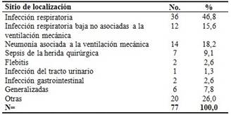 Según sitio de localización de la infección nosocomial predominaron en un 46,8 % las infecciones respiratorias, de ellas las de localización baja no asociadas a la ventilación mecánica representaron el 18,2 % y las asociadas a la ventilación mecánica el 15,6 %; le continuaron las otras infecciones con un 26,0 % y la sepsis generalizada constituyeron el 7,8 %. (Tabla 2).