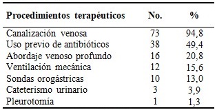 Los procedimientos terapéuticos como la canalización de venas, si no es realizada con la calidad requerida, contribuyen a la introducción de bacterias contaminantes, agravando al paciente.17 Este estudio muestra que se realizó este proceder al 94,8 % de los pacientes infectados en el servicio.
