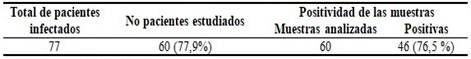 Se realizó estudio microbiológico a 60 pacientes para un 77,9 % del total de infectados. Fueron positivas 46 muestras (76,7 %). (Tabla 4).