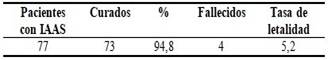 De los 77 casos infectados fueron dados de alta completamente curados 73 pacientes (94,8 %); sólo 4 pacientes fallecieron para una letalidad de un 5,2 %. (Tabla 5).