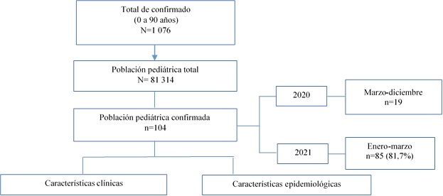 Se realizó un estudio observacional, descriptivo, transversal, ambispectivo en la provincia de Cienfuegos. El horizonte temporal fue desde marzo del 2020 hasta marzo del 2021. El universo de estudio quedó constituido por los 104 pacientes (100 %) menores de 18 años confirmados con COVID-19.