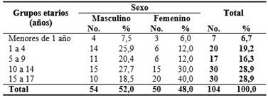 El grupo etario que predominó fueron los adolescentes (10 a 17 años) con 60 pacientes, que representa el 57,6 % de la serie estudiada. Es importante destacar, que el 6,7 % correspondió a los menores de 1 año. Existió un discreto predominio del sexo masculino 54 (52%). (Tabla 1).