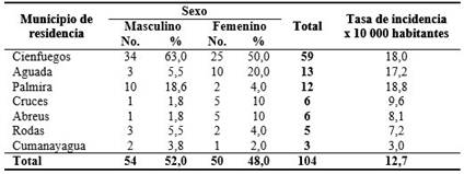 En el análisis de la distribución de los pacientes según municipio de residencia y sexo se detectó que el mayor número de casos (59/104) pertenecían al municipio cabecera, sin embargo, la mayor tasa de incidencia correspondió al municipio de Palmira (18,8 x 10 000 habitantes menores de 18 años), seguido de Cienfuegos y Aguada. (Tabla 2).