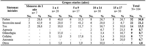 Del total de pacientes confirmados 58 (56 %) estaban asintomáticos y solo el 44 % presentó algún síntoma inicial. La fiebre se encontró en el 30 % de la serie estudiada, con predominio en todos los grupos etarios, excepto en los lactantes y niños de 5 a 9 años. Para estos grupos de edades la fiebre se presentó con una frecuencia ligeramente inferior a la secreción nasal. La ageusia y la anosmia fueron síntomas identificados con mayor frecuencia en los adolescentes. (Tabla 3).