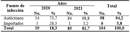 La fuente de infección autóctona predominó en la serie estudiada con un 94,2 %. Es necesario destacar que los casos importados se presentaron con mayor frecuencia en el año 2020. (Tabla 4).