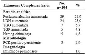 Al distribuir los pacientes según los exámenes complementarios se demostró que el 48 % (50/104) de los confirmados presentaron al menos un examen complementario alterado desde el momento del diagnóstico. Existió un predominio evidente de las alteraciones enzimáticas asociadas a la infección viral; en el 3 % de los pacientes el PCR positivo fue persistente y las alteraciones radiológicas se encontraron con muy baja frecuencia (1%). (Tabla 5).