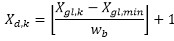 A pesar de que los diferentes tipos de formatos de imágenes histopatológicas contienen múltiples resoluciones, el análisis se realiza a una escala de aumento de 40× ya que esta demostró mejores resultados que otras escalas en un estudio realizado. 13 La imagen de entrada de alta resolución se secciona en mosaicos de 50 × 50 píxeles para el procesamiento por bloques. Cada mosaico de imagen se procesa de manera independiente en el bloque de extracción de características. Este permite reducir el volumen de información original en la imagen a un conjunto más pequeño de características representativas de color y textura. Las características de color se calculan mediante el histograma de color normalizado, 14) aplicado a cada canal de la imagen en el espacio de color RGB. Estas brindan información de color de las estructuras celulares (núcleo, estroma, citoplasma) presentes en la imagen, las cuales toman cierta coloración dependiendo del agente de tinción utilizado durante la preparación de las muestras. Las características de textura permiten obtener información acerca de la distribución espacial y apariencia de las estructuras celulares presentes en las imágenes. Estas se calculan a partir de una serie de matrices descriptivas (GLCM , GLRLM, GLSZM, GLDM) 15,16,17) que caracterizan la dependencia espacial de los niveles de gris en la imagen. Para el cómputo de dichas matrices se convierten los mosaicos de imagen del espacio de color RGB a escala de grises por el método basado en la luminancia. 14 La cantidad de niveles de gris en la imagen influye notablemente en el tamaño de las matrices, por lo que para hacer el cálculo computacionalmente manejable se debe realizar una reducción de los niveles de gris de los mosaicos. 15 El proceso de reducción se realiza dividiendo el rango de intensidades de gris en intervalos discretos de ancho fijo como se define en la ecuación:(formula 1)