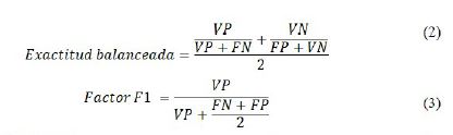 El desempeño del algoritmo fue evaluado en el conjunto de pruebas utilizando las métricas de exactitud balanceada y factor F1 como se define en las ecuaciones (2) y (3) respectivamente. Estas métricas son más robustas para la evaluación en conjuntos donde existe desbalance en la cantidad de ejemplos de cada clase.(Formula 2) 18