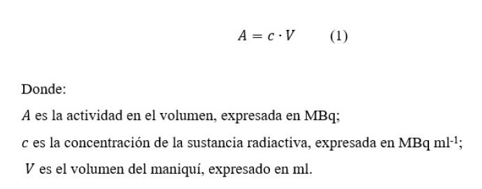 Se utilizó una fuente radiactiva de 131 𝐼 , y una concentración inicial de 0,123 MBq ml-1 y una actividad de 1,09× 10 6 MBq, determinada por la relación: