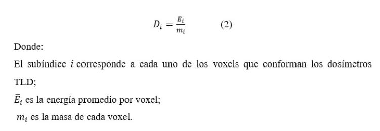 El software GATE permite calcular la dosis. Esto se logra con el actor DoseActor el cual registra la dosis en cada uno de los voxel en unidades de grey Gy. En este caso se utilizó una red tridimensional de 5x5x5 voxels de dimensiones 1 × 1 × 12 mm, que representan las dimensiones de cada dosímetro por separado.