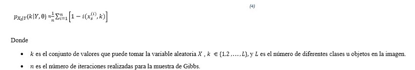 Entonces, en el primer paso, el algoritmo MPM se usa para obtener aproximaciones de las funciones de masa de probabilidad condicional marginal de X, usando las estimaciones de 𝜃. O sea, se estima 𝑝 𝑋 𝑠 𝑌 ( 𝑘 𝑌, 𝜃 (𝑝−1) ) ∀ 𝑠∈𝑆 y 𝑘=1,…𝐿, usando una muestra de Gibbs (Geman, 1984 #12), y la siguiente ecuación(fig.2 )