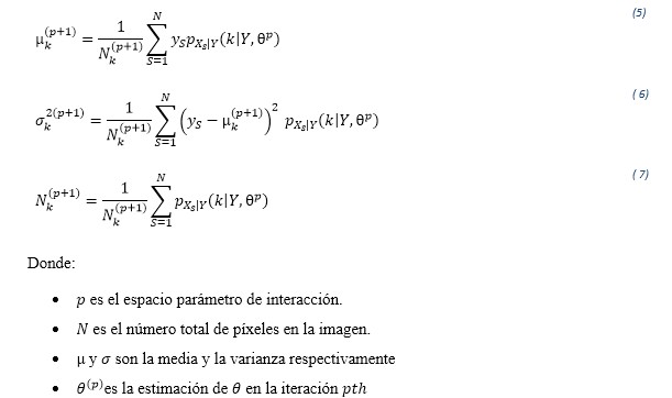 El algoritmo puede ser resumido en dos pasos. Para esto se considera que el elemento de un campo aleatorio 𝑋 en la ubicación espacial 𝑠 ⋲ 𝑆, se denota como 𝑋 𝑠 . El campo de etiqueta se denota como 𝑋 y la imagen observada como 𝑌. Entonces, 𝜃 es un vector no aleatorio cuyos elementos son los parámetros desconocidos de la función de densidad de probabilidad condicional de 𝑌 dada por 𝑋. Las muestras de los campos aleatorios se denotan como 𝑥 y sus imágenes como 𝑦.