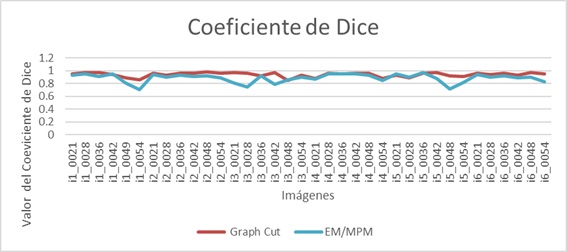 En la figura 4 se puede observar la evaluación de la calidad de la segmentación con Graph Cut y EM/MPM a partir del coeficiente de Dice para las 36 imágenes seleccionadas para la prueba. (En la figura las imágenes son nombradas de la forma ia_00b, donde a es el número del paciente y b es el corte seleccionado). Se aprecia que existe una mayor fluctuación entre pacientes para el método EM/MPM que para Graph Cut. Es decir, el método Graph Cut es más preciso al obtener el contorno del hígado de cada paciente y por tanto más eficaz para la tarea planteada. (Fig. 7).