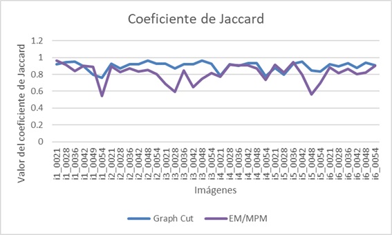 La figura 5 muestra la evaluación de la calidad de la segmentación con Graph Cut y EM/MPM a partir del coeficiente de Jaccard por cada imagen. Se aprecia igualmente, que existe una mayor fluctuación por paciente para el método EM/MPM que para Graph Cut y que en general este último muestra mayor precisión y por ende eficacia para la tarea prevista. (Fig. 8).