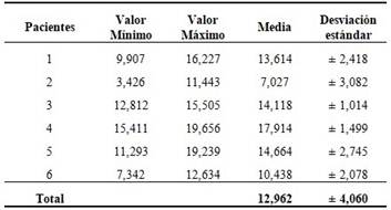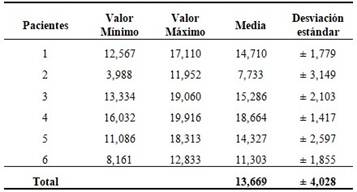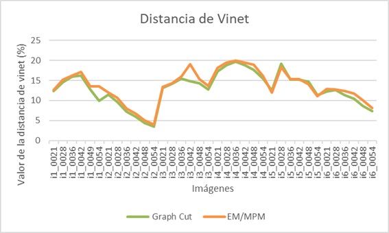 En las tablas 5 y 6 se observan las medias por paciente del cálculo de la distancia de Vinet para los métodos Graph Cut y EM/MPM respectivamente. Los resultados obtenidos en el cálculo de la distancia de Vinet se interpretan de forma diferente a los obtenidos con los coeficientes de Dice y Jaccard. Aquí mientras más pequeña es la distancia más precisa será la segmentación de las imágenes, por existir menos diferencias entre referencia y segmentación. Por consiguiente, realizando una valoración visual de los datos, se puede decir que el método de segmentación Graph Cut proporciona distancias más pequeñas y ratifica su mayor eficacia para segmentar hígado. (Tabla 5 y Tabla 6).