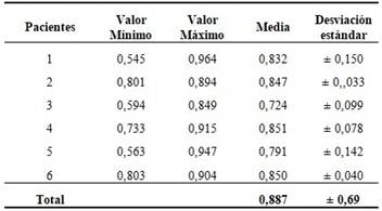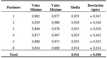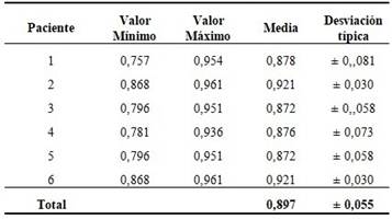 En las tablas 1 y 2 se observan las medias por paciente del cálculo del coeficiente de Dice para los métodos Graph Cut y EM/MPM respectivamente. La media del coeficiente de Dice revela que en el método Graph Cut la segmentación fue buena, pues en todos los pacientes supera el valor de 0,90. En el caso del método de EM/MPM se puede observar un valor bajo en el paciente 5. En este caso fue donde se segmentaron estructuras no deseadas junto con el hígado. Realizando una valoración visual de los datos obtenidos, con el cálculo de los coeficientes de Dice, (sin haber realizado el análisis estadístico), se puede decir que el método de segmentación que mejores resultados ofreció en este experimento fue Graph Cut. En cada uno de los pacientes la media del coeficiente de Dice para este método fue superior que en el método EM/MPM. (Tabla 1 y Tabla 2).