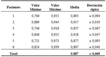 En las tablas 3 y 4 se observan las medias por paciente del cálculo del coeficente de Jaccard para los métodos Graph Cut y EM/MPM respectivamente. Realizando una valoración visual de los datos obtenidos con el cálculo de los coeficientes de Jaccard, al igual que con el coeficiente de Dice, se pueden observar valores bajos para el paciente 5 en el método EM/MPM, mientras que los valores para el método Graph Cut superan siempre la media de 0,85. (Tabla 3 y Tabla 4).