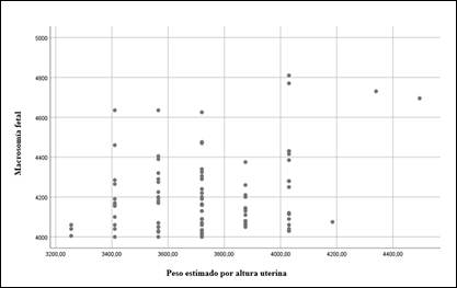 Así mismo, se halló baja correlación entre la estimación de peso fetal por altura uterina y la macrosomía fetal, precisando la altura de presentación a través de la fórmula de Jhonson. En el estudio de Galván15) la altura uterina tuvo eficacia para el diagnóstico de macrosomía fetal. Por otro lado, la estimación por ecografía obstétrica para macrosomía no expresó correlación. En tal sentido, se coincide con Sheron,16 en cuyo análisis no existió concordancia entre la ecografía obstétrica y el peso fetal; sin embargo, estudios realizados en países desarrollados17,18,19 afirman que la ecografía obstétrica es un mecanismo para predecir macrosomía fetal con exactitud, porque aplican tecnología de punta. Finalmente, el estudio de Borrego y colaboradores20 señala diferencias e inexactitud en la estimación del peso fetal por ecografía en los últimos trimestres de gestación, y en oposición a los resultados, Román21 afirma que ninguno es eficaz para predecir macrosomía fetal.