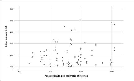 Resultados: la estimación del peso fetal y la macrosomía se correlacionaron con la altura uterina (R Pearson < 0,05), no así con la ecografía obstétrica (R de Pearson > 0,05). Entre las características maternas asociadas a neonatos macrosómicos, se hallaron la obesidad pregestacional (Rho = 0,009) y la condición de multigesta (Rho = 0,04). La estimación del peso fetal mayor a 4000 g tuvo mayor porcentaje de acierto (26,3 %) por ecografía obstétrica.