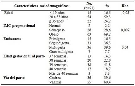 La edad materna predominante fue de 20-35 años (59,3 %), seguidas de las mayores de 35 años (24,2 %). El índice de masa corporal pregestacional indicó obesidad en la mayoría de ellas (69,2 %). El 39,6 % clasificaron como multigesta; el 41,8 % fueron partos a las 39 semanas; y fue más frecuente el parto vaginal (60,4 %). y las características maternas asociadas a la macrosomía fetal resultaron el IMC pregestacional (Rho = 0,009; IC, 95%) y la multiparidad (Rho = 0,006; IC, 95%). (Tabla 1).