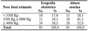 El peso fetal estimado por altura uterina y por ecografía obstétrica evidenció valores cercanos (22,0 % y 26,3 % cada uno), encontrándose a la mayoría con estimaciones dentro de lo normal (56,1 % versus 61,5 %).