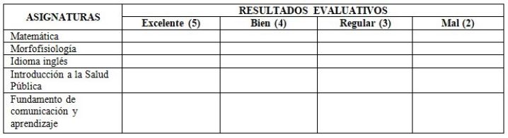 2- Analice detenidamente la tabla que se le presenta, para luego responder la interrogante, marcando con una cruz la casilla correspondiente: ¿Cuáles fueron sus resultados académicos, luego de realizar el examen ordinario y el primer extraordinario de las asignaturas que se señalan, al concluir el primer semestre del presente curso escolar 2018-2019?