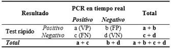 a: número de muestras positivas en ambos ensayos: prueba rápida y prueba de referencia (verdaderos positivos: VP).