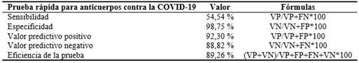 Methods: descriptive study, carried out with patients admitted to the Héroes de Playa Girón Specialized Ambulatory Center, in Cienfuegos, with a presumptive, probable or confirmed diagnosis of COVID-19 during two periods of time. All of them underwent a rapid test to detect anti-COVID-19 antibodies, in addition to a confirmatory molecular biology test. Diagnostic sensitivity and specificity, predictive values, and rapid test efficiency were calculated within a 95% confidence interval.
